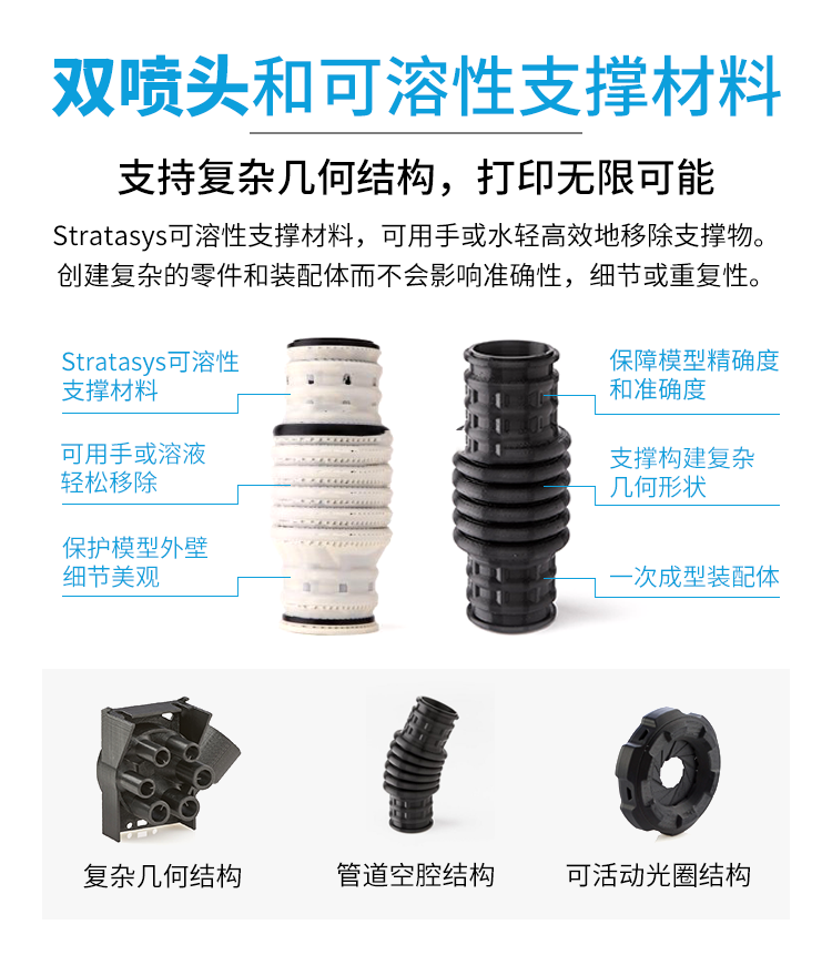 從經(jīng)濟實惠的F120TM到多功能的F370,F(xiàn)123系列打印機帶來無與倫比的選擇。它能夠使用更廣泛的材料,包括碳纖維ABS和彈性體”。它還可以借助我們獨特的水溶性支撐材料制作復(fù)雜的幾何形狀和聯(lián)鎖組件。無論零件有多復(fù)雜,水溶性支撐材料都可以溶解,只留下光潔表面,而無需手動去除。